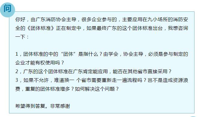 问:你好,由广东消防协会主导,很多企业参与的,主要应用在九小场所的消防安全的《团体标准》正在制定中,如果最终广东的这个团体标准出台,我想咨询一下: